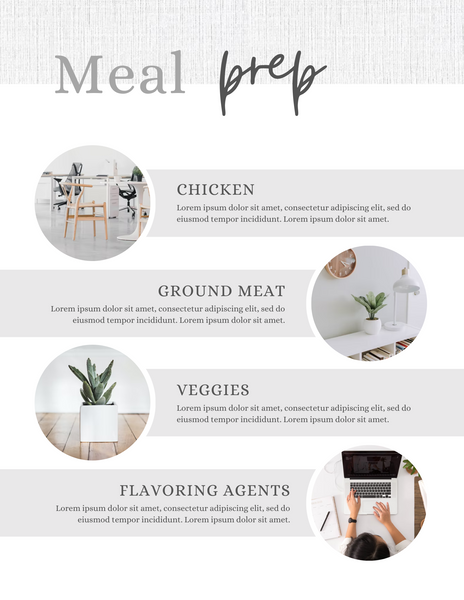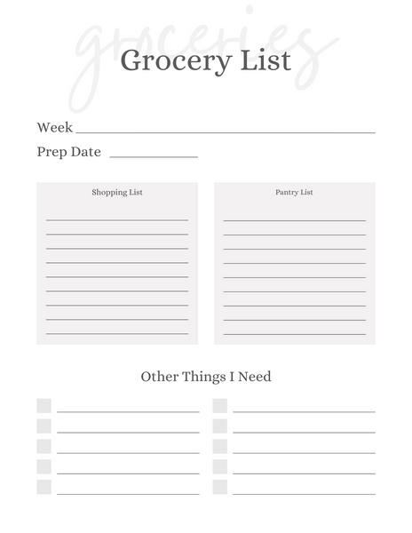 With my meal prep system, a little time on Sunday will save you hours throughout the week. Grocery shopping is easy, too. List is laid out in typical grocery store categories.